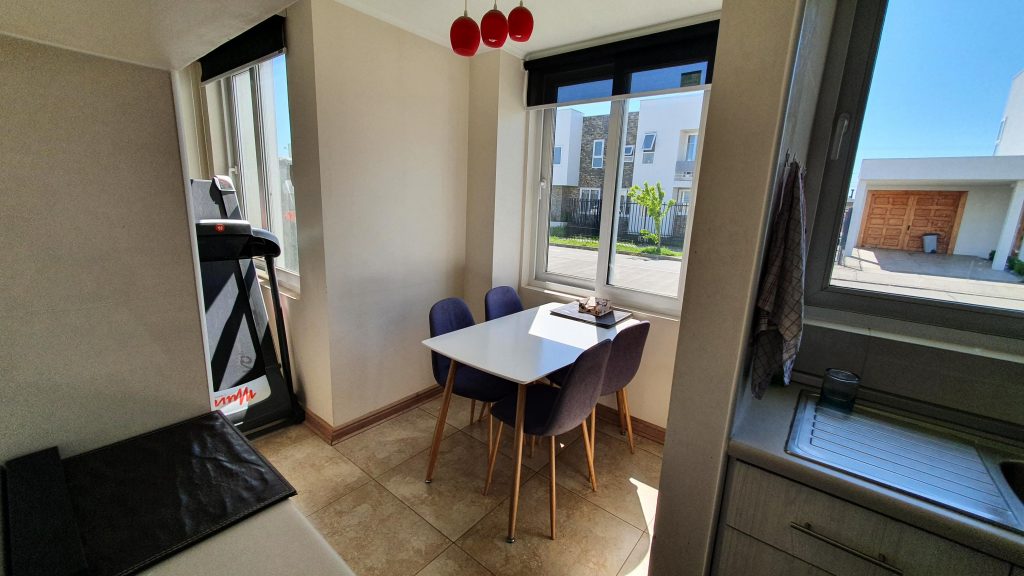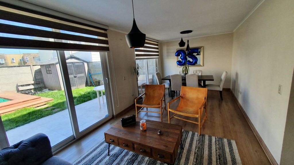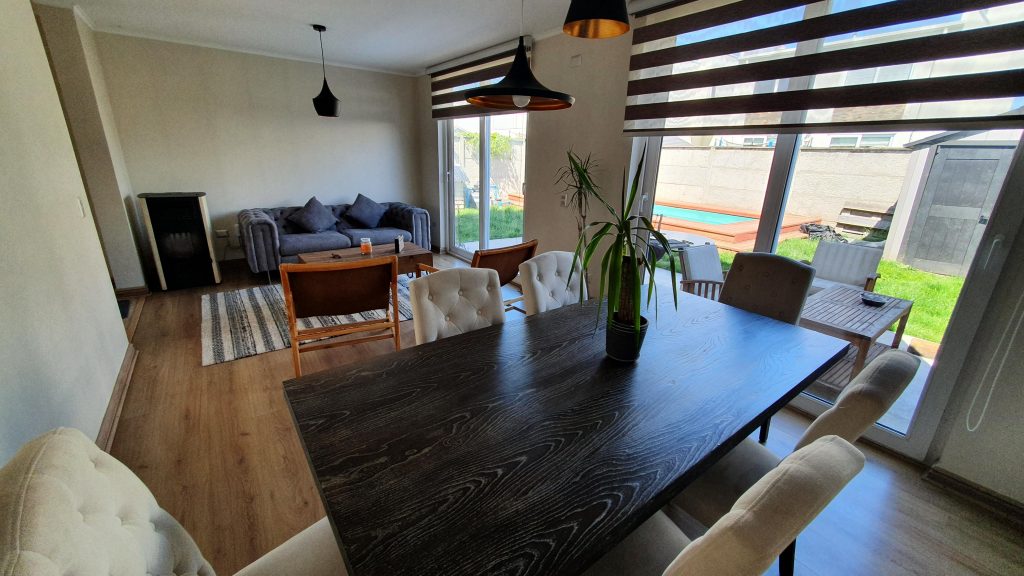 La casa cuenta con hall de acceso, living comedor, cocina con comedor de diario, logia y sala de estar, baño de visitas, dormitorio principal con baño en suite y pequeña terraza, dos dormitorios y un baño completo. Terraza, piscina y bodega.