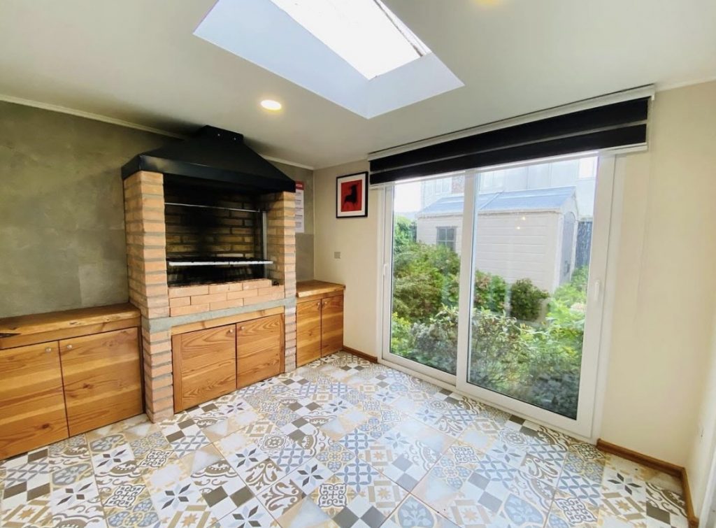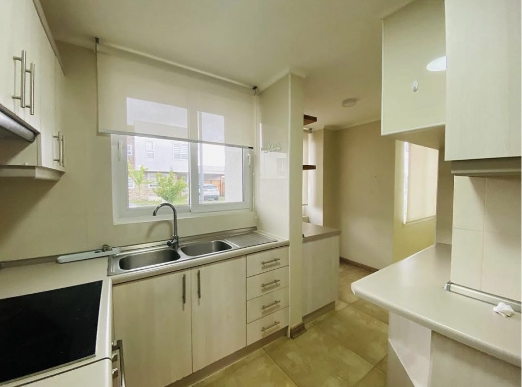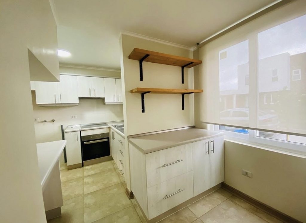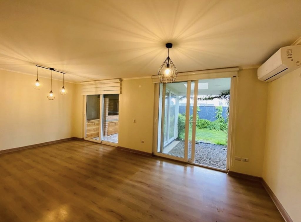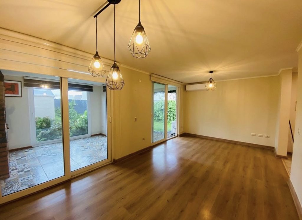 La casa cuenta con living comedor, cocina con comedor de diario o sala de estar, baño de visita, dormitorio principal con baño en suite, dos dormitorios, un baño completo y un espacio para escritorio. Quincho cerrado, loggia, bodega, terraza y estacionamiento techado. Calefacción con aire acondicionado, ventanas termopanel, piso flotante en toda la casa
