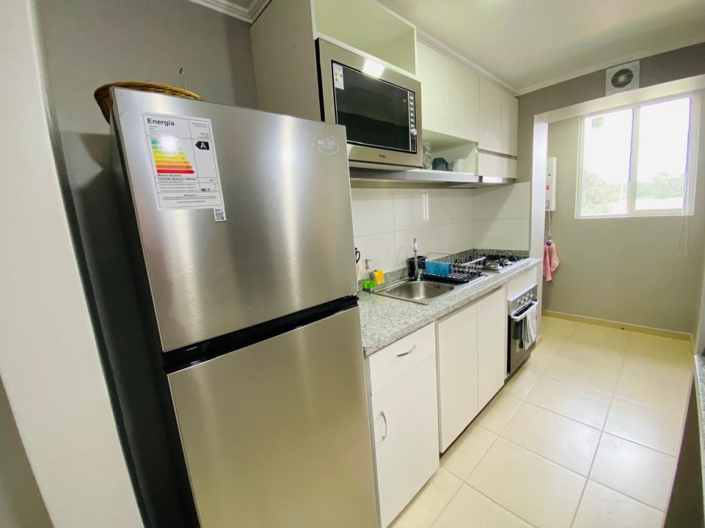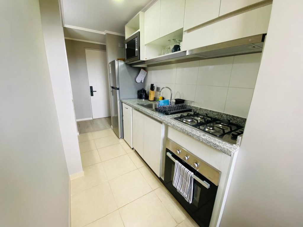 • Cocina semi abierta equipada (horno, cocina, campana y microondas)
